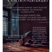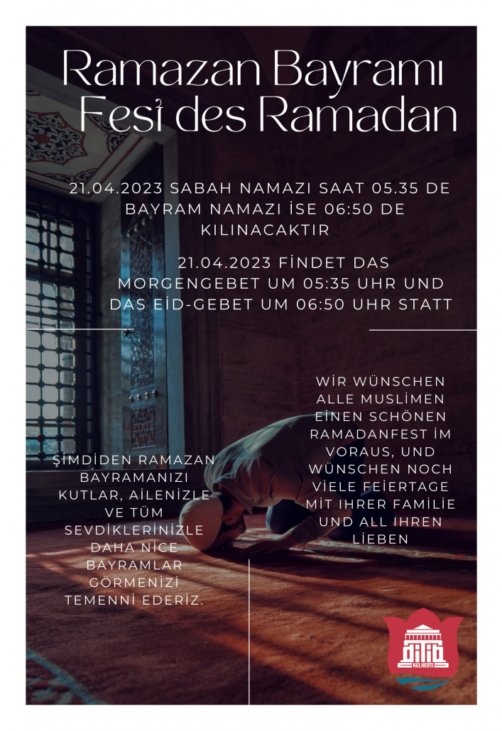 Am Eid-Tag 21.04.2023 findet das Morgengebet um 05:35 Uhr und das Eid-Gebet um 06:50 Uhr statt.Wir wünschen alle Muslimen einen schönen Ramadanfest im Voraus, und wünschen noch viele Feiertage mit Ihrer Familie und all Ihren Lieben.